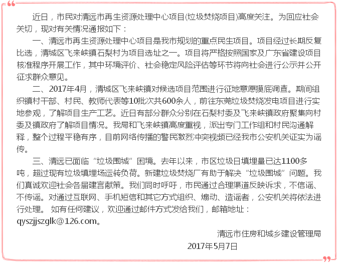 關(guān)于清城區(qū)飛來峽鎮(zhèn)石梨村清遠(yuǎn)市再生資源處理中心項(xiàng)目的情況通報